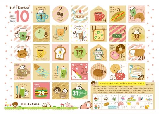 「mizutamaデザイン」の発売を記念し、大好評「デコラッシュ日付シート」のmizutamaさんコラボデザインを10・11・12月の3カ月限定で、無料配信いたします。10月の日付シートは9月27日からダウンロード可能です。デコラッシュ素材を盛り込んだかわいい日付シートをプリントアウトして、手帳やノートに貼ってお楽しみください。
