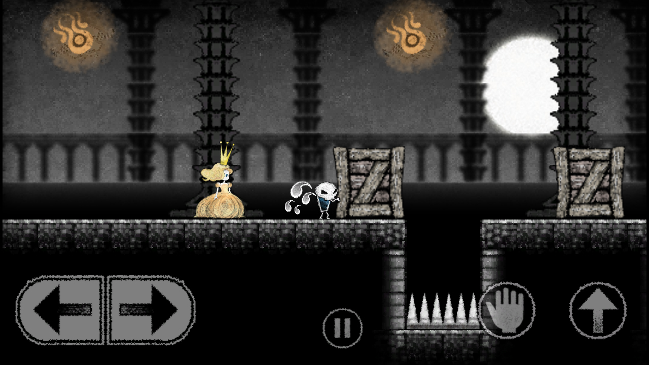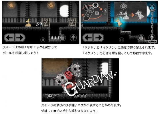 ● それぞれ能力の違うドクロとイケメンを使い分け、姫をトラップと敵から守りつつ、魔王城からの脱出を目指す、ギミックアクションゲームです。