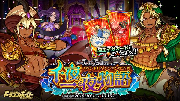 株式会社アソビズム(本社:東京都千代田区、代表取締役:大手智之)は、App Store・Google Playにて好評配信中のリアルタイム合体カードバトル『ドラゴンポーカー』で、2018年10月1日(月)より新スペシャルダンジョン「千夜一夜物語」を開催いたします。今回のダンジョンでは「シャハザマーン」や「シャフリヤール王」がボスモンスターとして登場!一緒に冒険する仲間と協力し、ボスモンスターを倒しましょう!