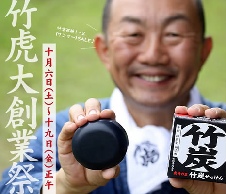 虎斑竹専門店 竹虎では、2018年10月6日(土)~19日(金)の正午まで「竹虎大創業祭♪ 竹炭石鹸1・2(ワンツー)SALE」を期間限定で開催。虎竹の里竹炭石鹸5個セットをご購入の方には1個、10個セットなら2個、竹炭石鹸をおまけサービスいたします。