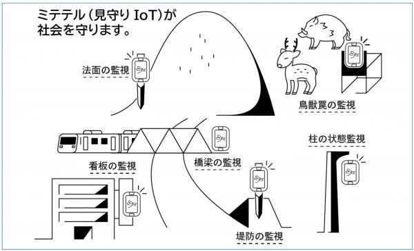 『ミテテル』は、インターネットに直接接続するLPWAとGPS、3軸重力センサーをバッテリ駆動して、設置した場所の変異を監視しながら1年間維持動作します。