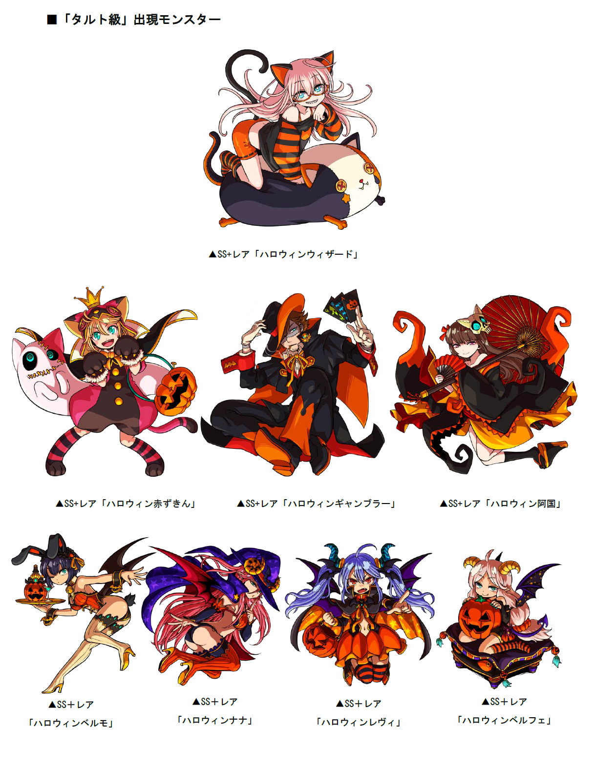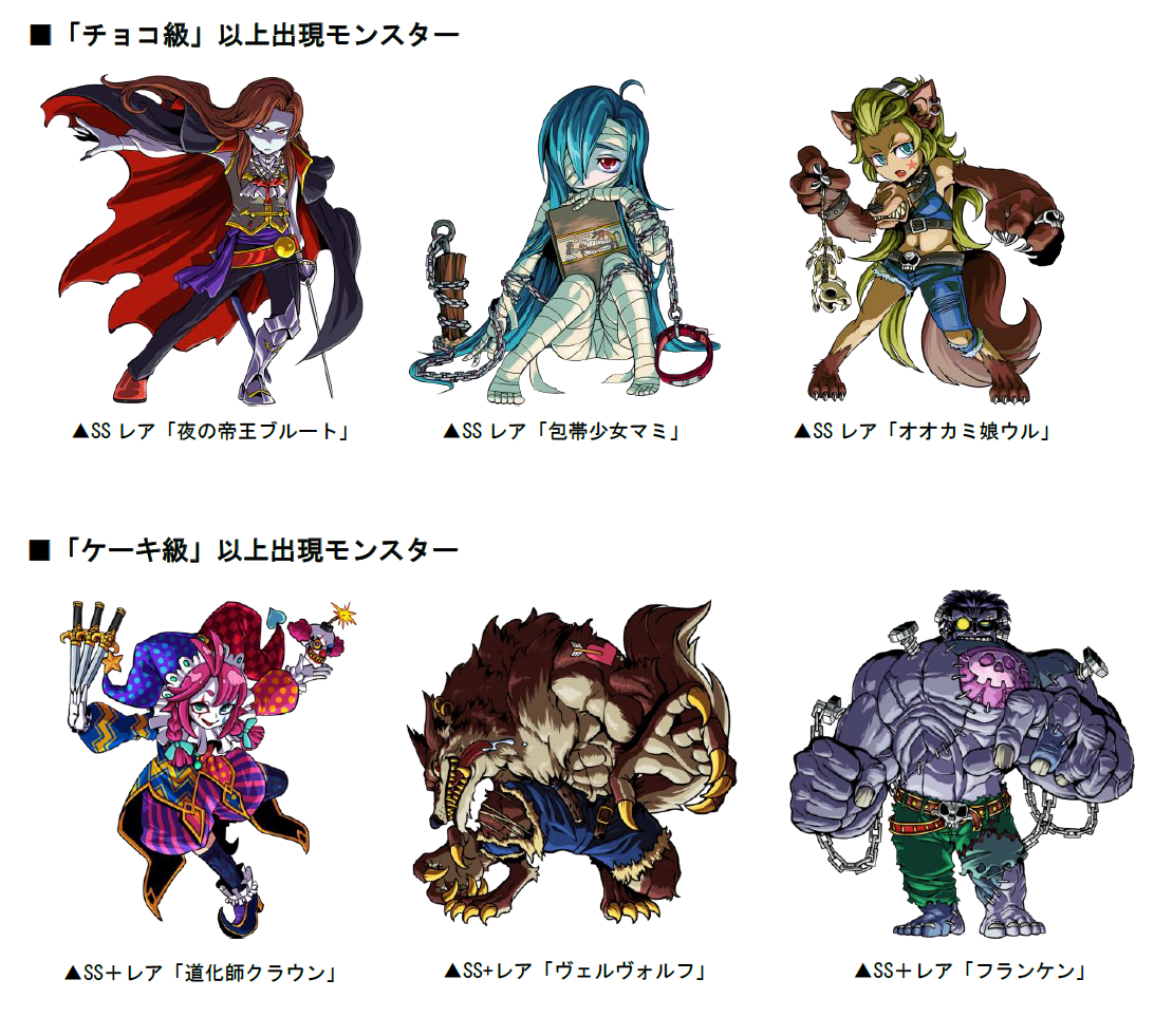 「チョコ級」以上のボスモンスターとして、SSレア「夜の帝王ブルート」「包帯少女マミ」「オオカミ娘ウル」が出現します。また、「ケーキ級」以上ではSS+レア「道化師クラウン」「ヴェルヴォルフ」「フランケン」が、「タルト級」では新たに追加された、「ハロウィンウィザード」が登場!他にも「ハロウィンベルモ」「ハロウィンナナ」「ハロウィンレヴィ」「ハロウィンベルフェ」、「ハロウィン赤ずきん」「ハロウィンギャンブラー」「ハロウィン阿国」がボスモンスターとして出現することがあります。