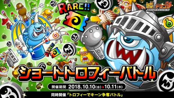 株式会社アソビズム(本社:東京都千代田区、代表取締役:大手智之)は、App Store・Google Playにて好評配信中の『城とドラゴン』で、2018年10月10日(水)より「ショートトロフィーバトル」を開催いたします。今回は、トロフィーバトルに勝利すると、所属リーグに応じたキーンが手に入る「トロフィーでキーン争奪バトル」を開催いたします。この機会に、トロPとキーンの獲得を目指しましょう!