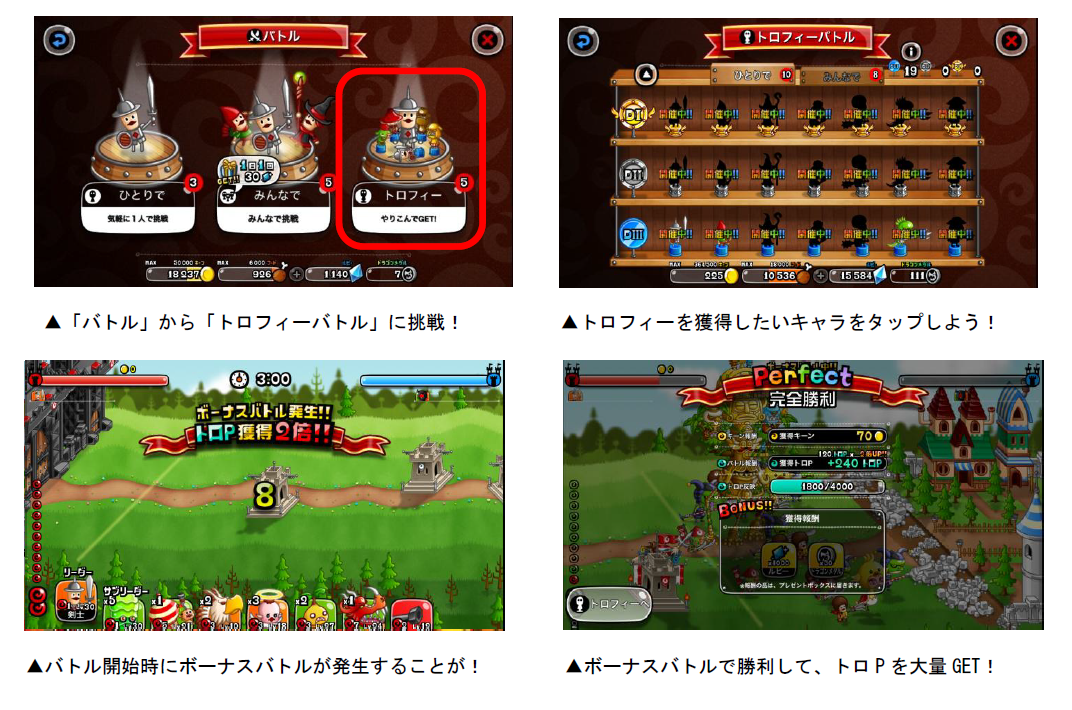 各キャラのトロフィーは、「トロP」を一定数貯めると獲得することができます。トロPは「キャラのLvが20以上」「うまP200以上」など、各キャラによって異なる条件を満たした状態でバトルを行なうと獲得できます。また、バトルを開始すると「ボーナスバトル」が発生することがあり、バトルの勝敗に関係なく、獲得トロPが2・3・5・10倍のうちいずれかの倍率で増加します。ボーナスバトルが発生したら、勝利してトロPの大量獲得を目指しましょう!