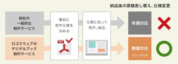ロゴスウェア株式会社(本社:茨城県つくば市、代表取締役社長:石神 優)は、デジタルブック制作サービスを全面リニューアルしました。主なポイントは(1)データ納品後でも3カ月間は無償修正(2)大量ページでも基本料金の上限を18万円(税別)とし、標準的なレギュラーグレードではページ単価14%値下げ(3)翌営業日納品対応グレードでデータ納品前に無償キャンセルOKー。修正容易な「デジタル」の良さを生かし、もっと手軽に安心してデジタルブック制作を依頼いただけるよう、料金・納期・修正に「安心」を添えてサービスを提供します。