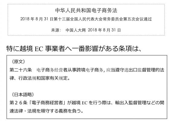 越境EC事業者へ最も影響がある条文は、「中華人民共和国電子商務法 第26条」です。