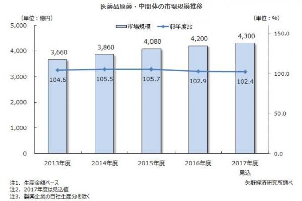 2017年度の医薬品原薬・中間体市場は前年度比2.4%増の4,300億円の見込