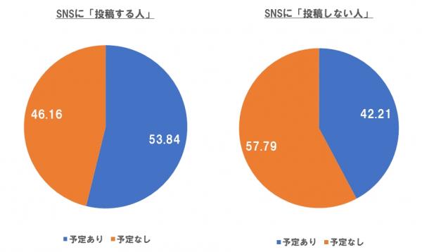 ここで私は、SNSを利用する人ほど「人に見せたい意識」を持っているのではないかと考え、SNSに子どもの写真を「投稿しない人」に比べ「投稿する人」の方が「ハロウィンをする予定」と回答する割合が多いのではないかという仮説をたて検証しました(図3参照)。