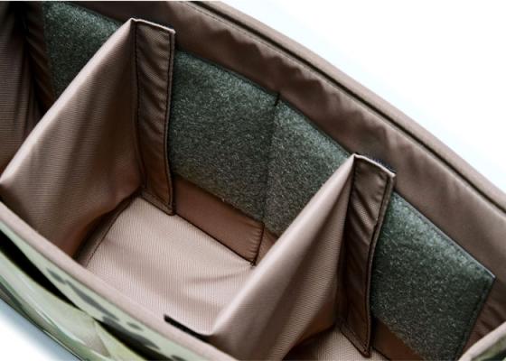 インナーケースには、ボディ1台、レンズ2本を収納できます。2枚の仕切りはマジックテープで自由に取り外しでき、入れるものに合わせて自在にレイアウトできます。