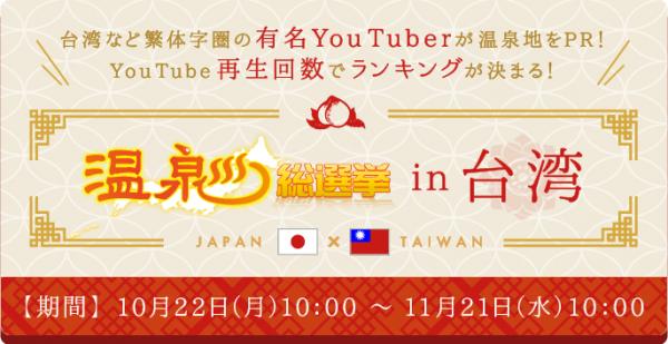 台湾など繁体字圏の有名Youtuber (フォロワー数3万人以上)が各温泉地のPR動画を作成し、そのYouTube再生回数を投票数としてランキングを競う企画です。