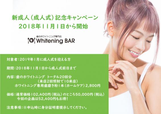 株式会社ピベルダ(所在地:東京都渋谷区)が展開する、WhiteningBARは。2019年1月に新成人(成人式)を迎える若者を応援するキャンペーンを2018年11月1日より開始いたします。SNSなどで情報を発信することが増えている中、笑顔で白い歯を記念に残すために企画いたしました。成人式までにキレイな歯を手に入れて一生に一度の思い出を素敵なものにしてください