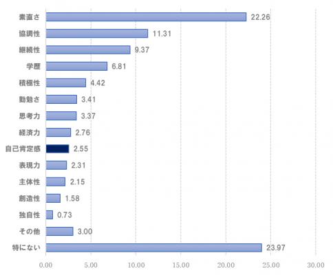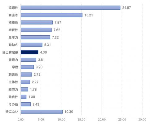 今回、調査結果の中で最も興味深いと感じたのは「素養」に関する結果である。本調査では「親から言われた重要な素養」、「実際に役立った素養」、「子どもの将来に重要だと考える素養」をそれぞれ質問した。3つの結果を並べたものが図2~図4である。その結果、素直さ・協調性・積極性に関してはどの項目においても上位であったが、おもしろいのが「自己肯定感」に関する結果である。「自己肯定感」は「親から言われた重要な素養」では2.55%ほど、「実際に役立った素養」では4.30%なのに対し「子どもの将来に重要だと考える素養」では素直さに次いで2番目に多く15.82%である。つまり「自己肯定感」を重要だと考える「いま」のママパパが多いということである。