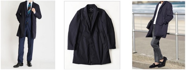 デザインは秋冬の定番アウターとして定着したチェスターコート型で、細身のシルエットにこだわりました。表地のやや張りのある形状記憶性の素材を活かして、中綿の膨らみをできるだけ目立たないように仕上げました。上品なネイビーカラーを採用し、ビジネススタイルはもちろんカジュアルスタイルとの相性も良く、着回しやすいコートです。