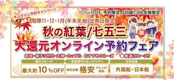 クルーズ予約サイト「ベストワンクルーズ」運営の株式会社ベストワンドットコム(本社:東京都新宿区、代表取締役:澤田秀太)は、10月31日から「秋の紅葉/七五三 大還元オンライン予約フェア」として、11月出発間際の厳選コースを対象とした割引キャンペーンを開始いたします。