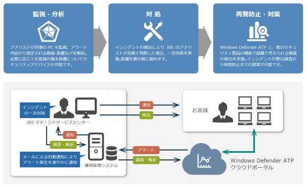 Windows Defender ATP が有効化された企業クライアント PC に対してサイバー攻撃がなされた場合、マイクロソフトの広範なデータとクライアントから収集したデータを組み合わせて分析し、アラートを発します。このアラートを JBS が受け取り、セキュリティ脅威・リスクを判断して必要に応じた適切な対処を行うほか、深刻なインシデントへの封じ込め対策、再発防止対策支援(オプションサービス)を実施します。