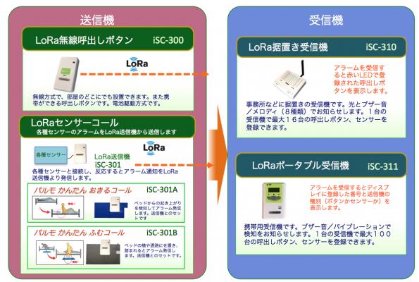 送信側は、持運び可能な呼出しボタンとともに、ベッドに置き、起上がりを検出する「パルモかんたんおきるコール」とマットセンサーを踏むと反応する「パルモかんたんふむコール」があります。 介護施設の状況によりこれらを選んで、最適な組合せが可能です。