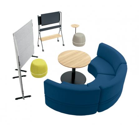 「ワークフラン」でラインアップする従来のアイテムと組み合わせて、ミーティングや集中作業などをスムーズに行えるさまざまなレイアウトを作ることができます。