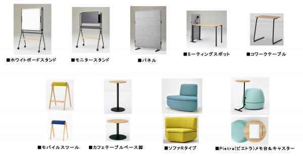 今回発売するのは、「パネル」「ミーティングスポット」「モバイルスツール」など新製品6アイテムと、「カフェテーブル」「ソファ」「ピエトラ」の3アイテムの新バリエーションです。