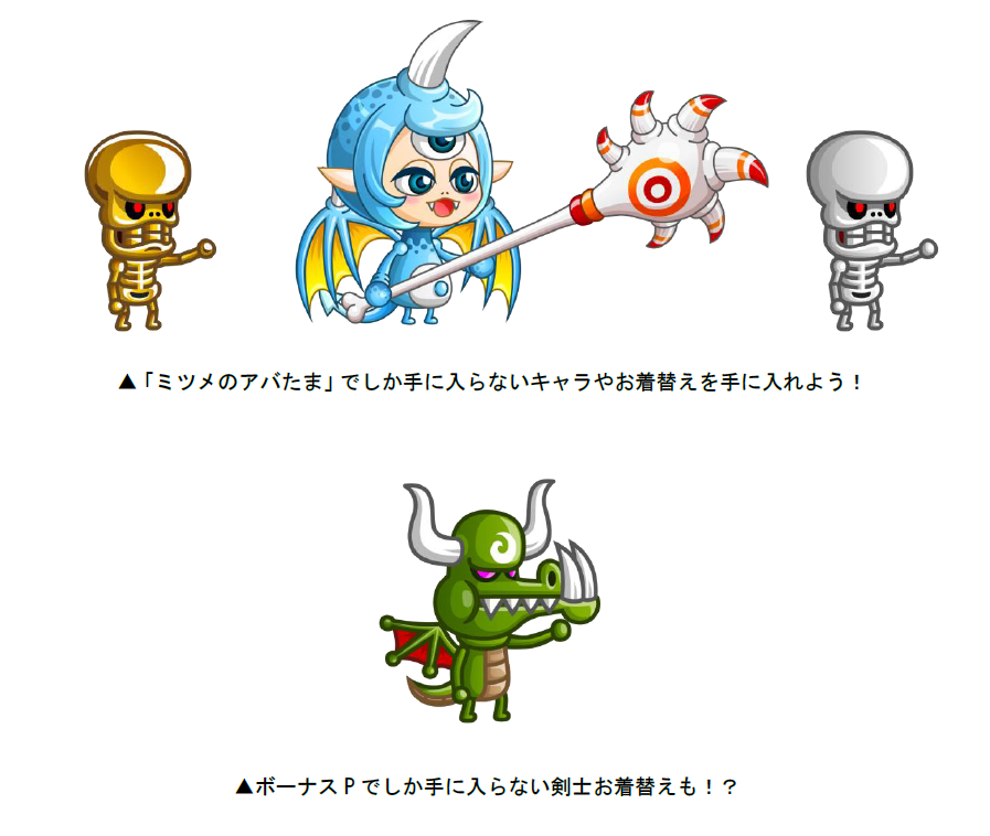 11月1日(木)より、新アバたま「ミツメのアバたま」を実装いたします。「ミツメのアバたま」では、新キャラ「サイクロガール」が手に入ります。その他にも、新たな限定剣士武具などのお着替え、バッジコイン、トロPなどのアイテムを手に入れることができます。また、アバたまを1回割るごとに「ボーナスP」と呼ばれる特別なポイントが手に入り、一定数まで到達すると、到達数に応じたアイテムや武具を獲得できます。アバたまを割って、様々なアイテムを手に入れましょう!