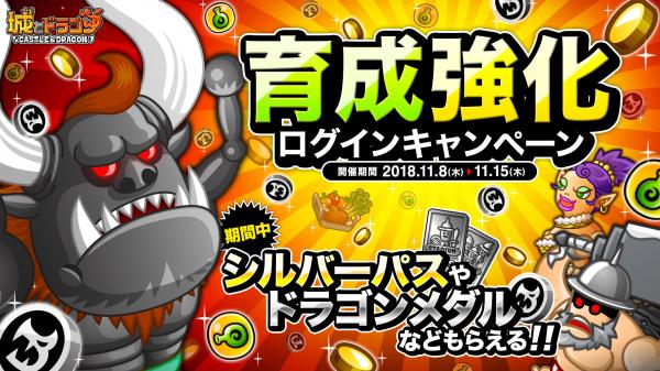株式会社アソビズム(本社:東京都千代田区、代表取締役:大手智之)は、App Store・Google Playにて好評配信中の『城とドラゴン』で、2018年11月8日(木)より「育成強化ログインキャンペーン」を開催いたします。また、城Lv20以下のプレイヤーと一緒にバトルを行なうと特典がある「ルーキーさまさまキャンペーン」を同時開催いたします。
