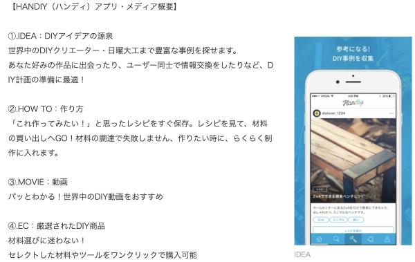 『HANDIY』は、DIYに関心を持つユーザーに対して、HOW TO情報の提供、オンラインショップとの連携等「DIYの困りごとを解決するプラットフォーム」を構築していることが特徴です。
