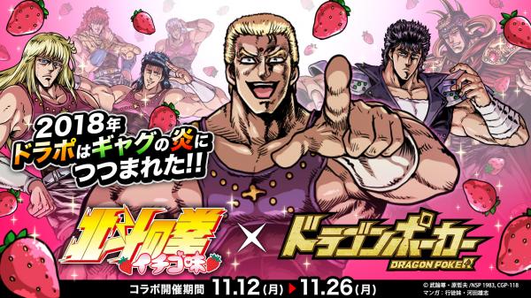 株式会社アソビズム(本社:東京都千代田区、代表取締役:大手智之)は、App Store・Google Playにて好評配信中のリアルタイム合体カードバトル『ドラゴンポーカー』で、2018年11月12日(月)よりギャグマンガ『北斗の拳 イチゴ味』とのコラボイベントを開催いたします。イベント期間中、ギャグマンガ『北斗の拳 イチゴ味』のキャラクターたちが『ドラゴンポーカー』に登場!期間限定で開催される夢のコラボイベントをどうぞお楽しみください。