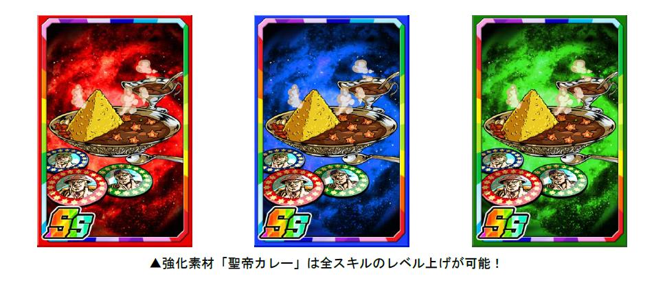 「イチゴP」を使い、素材ガチャを回すと限定強化素材「聖帝カレー」を手に入れることができます。「聖帝カレー」は経験値がアップするだけでなく、全スキルのレベル上昇率がアップします。