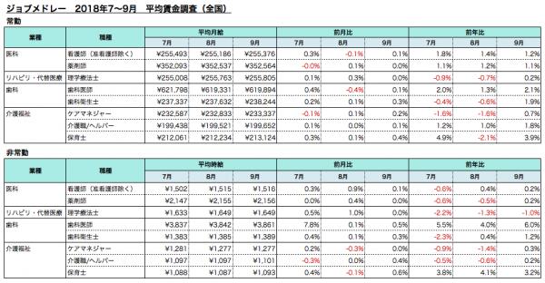 株式会社メドレー(本社:東京都港区、代表取締役医師:豊田 剛一郎、代表取締役社長:瀧口 浩平)が運営する医療介護求人サイト「ジョブメドレー」は、医療介護系8職種について、2018年7~9月の平均月給・時給をまとめ、2018年11月12日に発表しました。