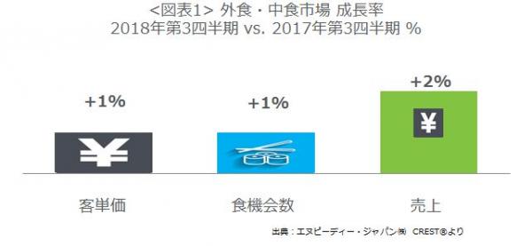 外食・中食市場全体の2018年第3四半期の成長率(図表1)をみると、客数(食機会数)が5四半期ぶりにプラスに転じ1%増となりました。客単価も引き続き成長し1%増加、売上(市場規模)は、5兆341億円で対前年同期比2%増、8期連続のプラス成長となりました。