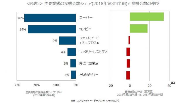 業態別の食機会数の成長率(図表2)をみてみると、全体の26%を占めるシェア1位のスーパーマーケットが5四半期ぶりにプラスに転じ、34百万回(+1.4%)増加、市場の成長をリードしました。コンビニはシェア2位で、18百万回(+0.8%)増となりました。猛暑や度重なる自然災害の影響で、外食業態の食機会数は軒並み減少しました。