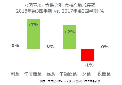 食機会別の成長率(図表3)をみると、午前間食、午後の間食がプラス成長でした。これは、猛暑で飲料の利用が増えたことが影響しています。夕食機会は、相次ぐ自然災害やJRの計画運休などの影響でマイナスとなりました。