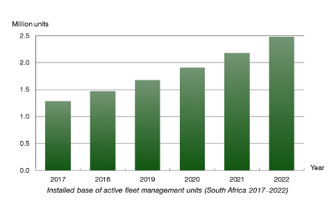 How will the market for fleet management systems for commercial vehicles in South Africa evolve in 2018 and beyond? Berg Insight forecasts that the number of fleet management systems in active use in South Africa will grow at a CAGR of 14.0 percent from 1.3 million units at the end of 2017 to 2.5 million by 2022.