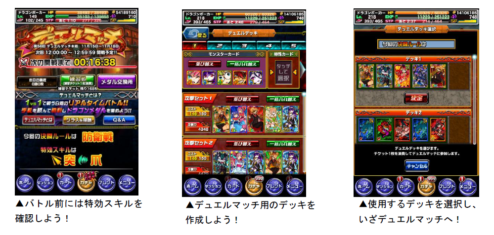 デュエルマッチでは、通常よりも高い効果を発揮する「特効スキル」が設定されています。今回の「デュエルマッチ」の特効スキルは、突・爪です。特効スキルのカードをデッキに入れて、有利にバトルを勝ち進めましょう。