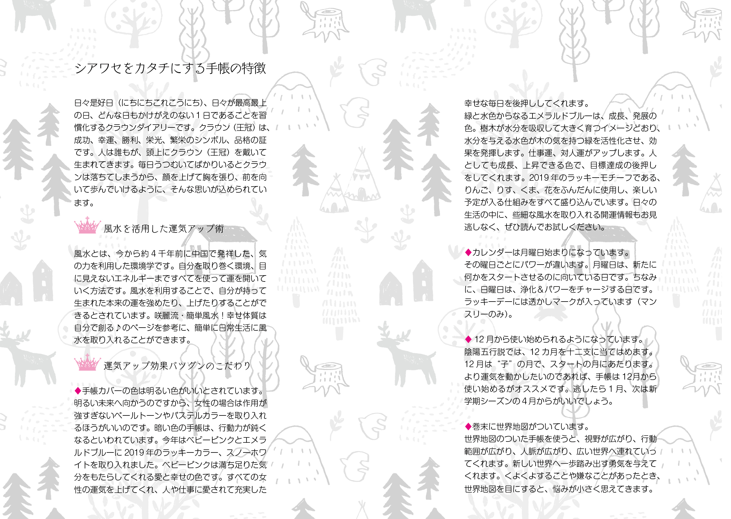 2色展開のベビーピンク、エメラルドブルーに2019年のラッキーカラー「スノーホワイト」を取り入れてかわいいツートーンカバーに。運勢、風水コラムも満載。使うだけで幸せになること間違いなしです!