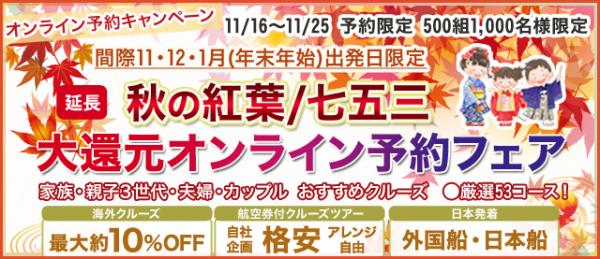 クルーズ予約サイト「ベストワンクルーズ」運営の株式会社ベストワンドットコム(本社:東京都新宿区、代表取締役:澤田秀太)は、11月15日まで「秋の紅葉/七五三 大還元オンライン予約フェア」を実施しておりましたが、好評の為11月25日まで期間を延長して予約を受け付けます。出発間際の厳選コースを対象とした割引キャンペーンとなり、16日からの予約で追加250名様に期間限定料金でご予約いただけます。
