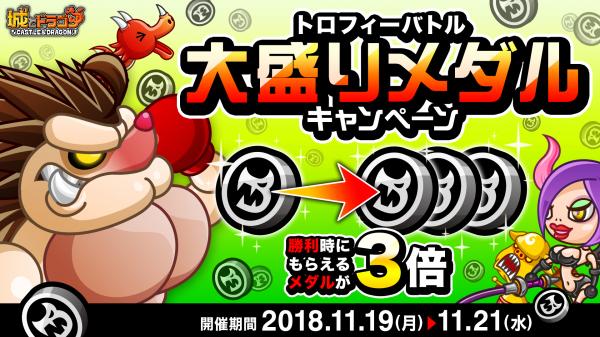11月19日(月)より、各キャラのトロフィー獲得を目指して、全国のプレイヤーとバトルを行なう「トロフィーバトル」を開催いたします。今回は「大盛りメダルキャンペーン」が開催され、バトルに勝利すると報酬としてもらえるドラゴンメダルが3枚に増量いたします。報酬獲得を目指して、トロフィーバトルに挑戦しましょう!