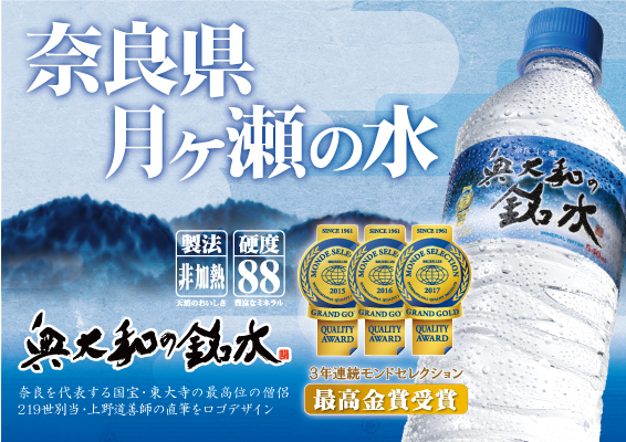 採水地が奈良県月ヶ瀬のミネラルウォーター『奥大和の銘水』。ロゴタイプは、奈良を代表するにふさわしい国宝・東大寺最高位の僧侶である、第219世別当・上野道善師の直筆