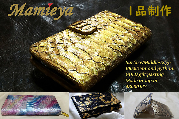 元々個性の強い蛇革(ダイヤモンドパイソン)に、1点づつ彩色や純金箔を加えた革作品を