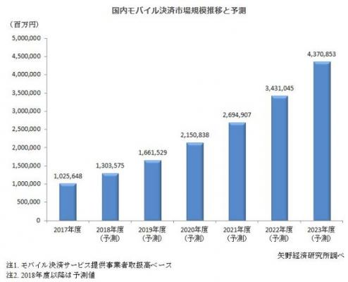 国内モバイル決済市場は2017年度の1兆円から2023年度には4.3兆円までの拡大を予測