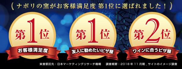 株式会社ストロベリーコーンズ(本社:仙台市青葉区、代表取締役社長:宮下雅光)の宅配ピザブランド「ナポリの窯」は、2018年11月に日本マーケティングリサーチ機構が実施した宅配ピザにおけるインターネット調査の結果、『お客様満足度No.1』『友人に勧めたいピザ屋No.1』2つの部門で第1位となりました。