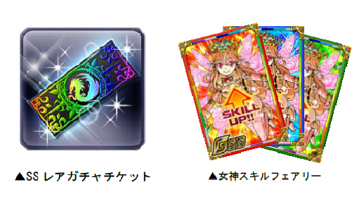 竜石 40個、SSレアガチャチケット 1枚、女神スキルフェアリー 各属性1枚ずつ、女王サンタフェアリー 各属性3枚ずつ、姫サンタフェアリー 各属性5枚ずつ、Sレア進化指輪各1枚ずつ