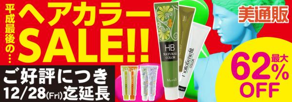 プロ向け美容材料の通信販売サイト「美通販」では、現在開催中の『平成さよならSALE!ヘアカラーMAX62%OFF!』のキャンペーン期間延長を決定いたしました。当該キャンペーンは2018年10月25日(木)から11月30日(金)までを対象期間としていましたが、ご好評をいただいていることを受け、2018年12月28日(金)まで期間延長の運びとなりました。期間中は、キャンペーン対象商品である人気メーカーのカラー剤を一挙にお値下げし、最大62%OFFの業界最安値を目指した美通販セール価格でご提供いたしますので、この機会にたくさんの方々にご利用いただければと考えております。