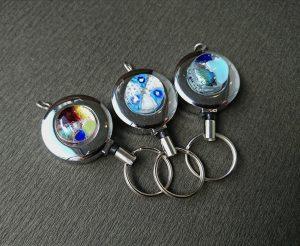 手作りガラスのチャームがついたリール式キーホルダーです。