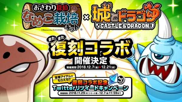 株式会社アソビズム(本社:東京都千代田区、代表取締役:大手智之)は、App Store・Google Playにて好評配信中の『城とドラゴン』で、株式会社ビーワークスならびに株式会社サクセスの『おさわり探偵 なめこ栽培キット』(以下、『なめこ栽培キット』)との復刻コラボイベントを、2018年12月7日(金)より開催することが決定いたしました。コラボ期間中でしか手に入らない限定キャラ「なめこ」もEGGショップに再登場!さらに復刻コラボイベント開催決定を記念して、本日11月29日(木)より「Twitterリツイートキャンペーン」を実施いたします。期間限定の復刻コラボをどうぞお楽しみにお待ちください!