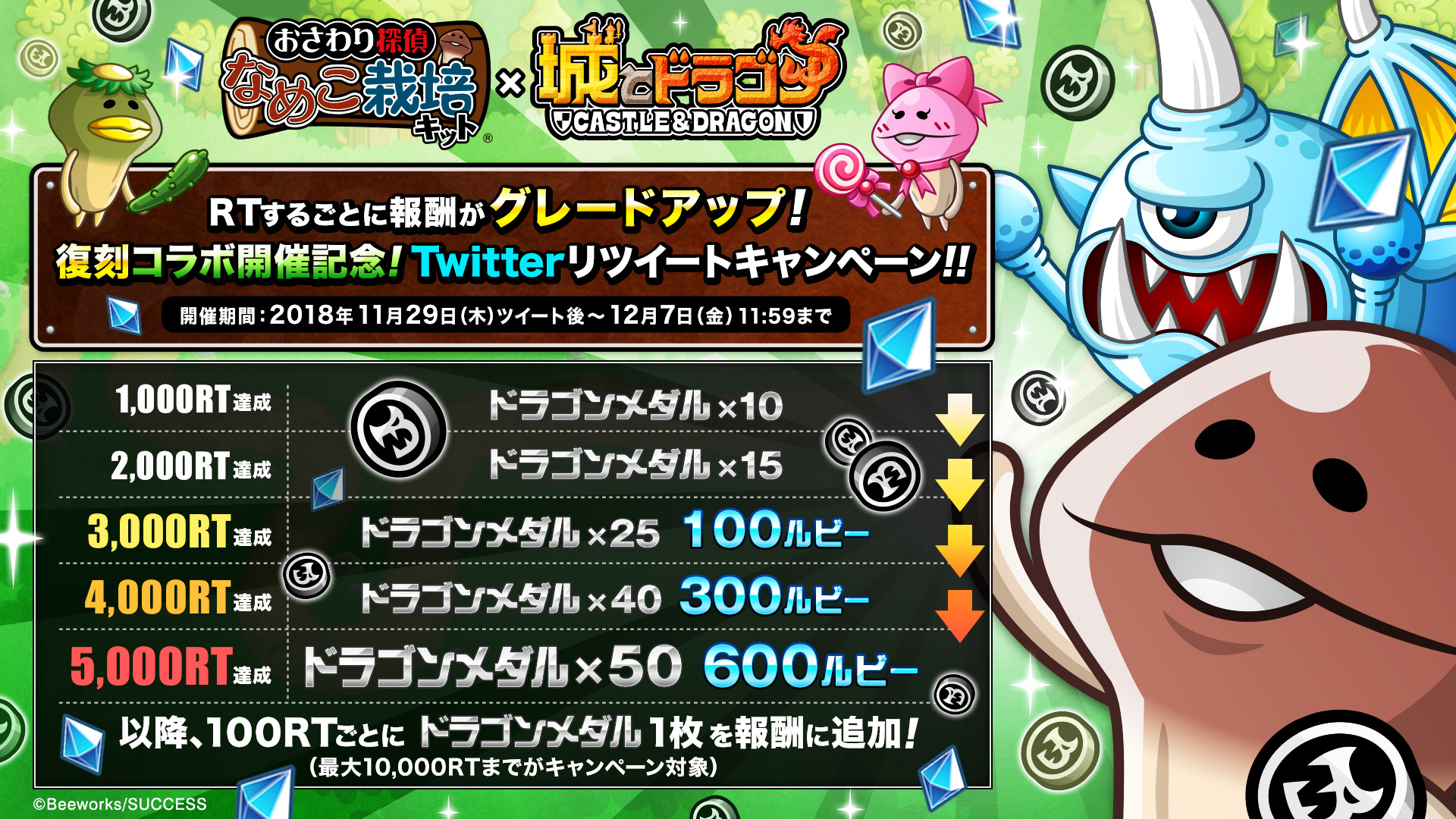 『なめこ栽培キット』との復刻コラボイベント開催決定を記念して、「Twitterリツイートキャンペーン」を開催いたします。『城とドラゴン』公式Twitterアカウント(@shirotodoragon)がつぶやいた、キャンペーン対象ツイートの公式リツイート総数に応じて、ドラゴンメダルやルビーをユーザー全員にプレゼントいたします。