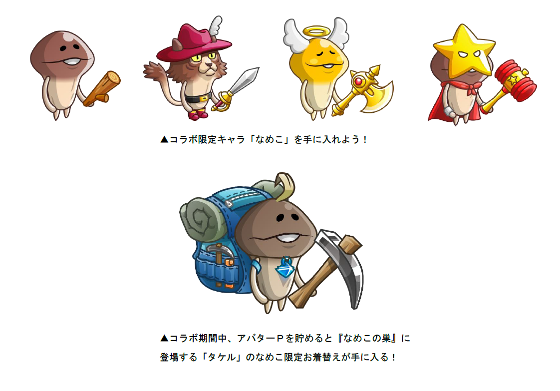 2018年12月7日(金)からのコラボ期間中、EGGショップにコラボ限定キャラ「なめこ」が再登場!キャラの研究開発を行なうことでさまざまな武具にお着替えさせることもできます。さらに、今回のコラボでは、『なめこの巣』に登場する「タケル」のなめこ限定お着替えが手に入るアバターPバトルキャンペーンが開催!たくさんアバターPを貯めて、豪華報酬を手に入れましょう!
