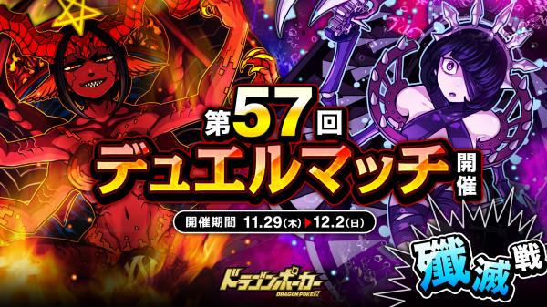 株式会社アソビズム(本社:東京都千代田区、代表取締役:大手智之)は、App Store・Google Playにて好評配信中のリアルタイム合体カードバトル『ドラゴンポーカー』で、2018年11月29日(木)より「第57回デュエルマッチ本戦」を開催いたします。今回のルールは「殲滅戦」です。デュエルマッチでは、バトルで獲得できる「デュエルP」に応じてランキングが決まり、リーグ終了時に報酬が獲得できます。また、累計勝利数に応じて、限定カードも手に入ります。相手の心理を読み、1vs1の真剣勝負に挑みましょう!