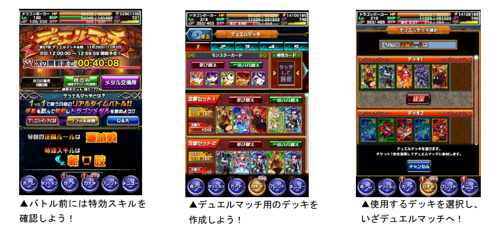 デュエルマッチでは、通常よりも高い効果を発揮する「特効スキル」が設定されています。今回の「デュエルマッチ」の特効スキルは、斬・咬です。特効スキルのカードをデッキに入れて、有利にバトルを勝ち進めましょう。