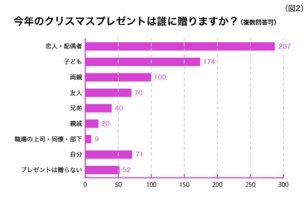 プレゼントを贈る相手は「恋人・配偶者」が1位に。恋人同士にとってクリスマスはやはり特別なイベントであることが分かります。2位には「子ども」がランクインし、クリスマスはサンタ役になるパパ・ママが多いようです。(※図2)