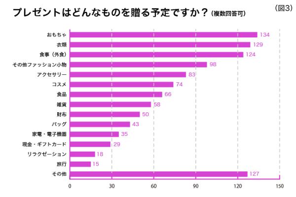 贈る予定のプレゼントは、対子ども票を集めて「おもちゃ」が1位に。僅差で2位「衣類」、3位「食事(外食)」も人気です。(※図3)